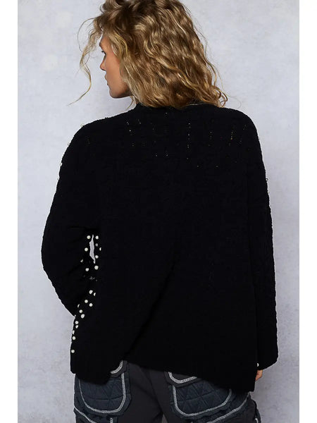 Designed in open cardigan, relaxed fit top in chenille sweater with pearl detail pointed solid pattern.